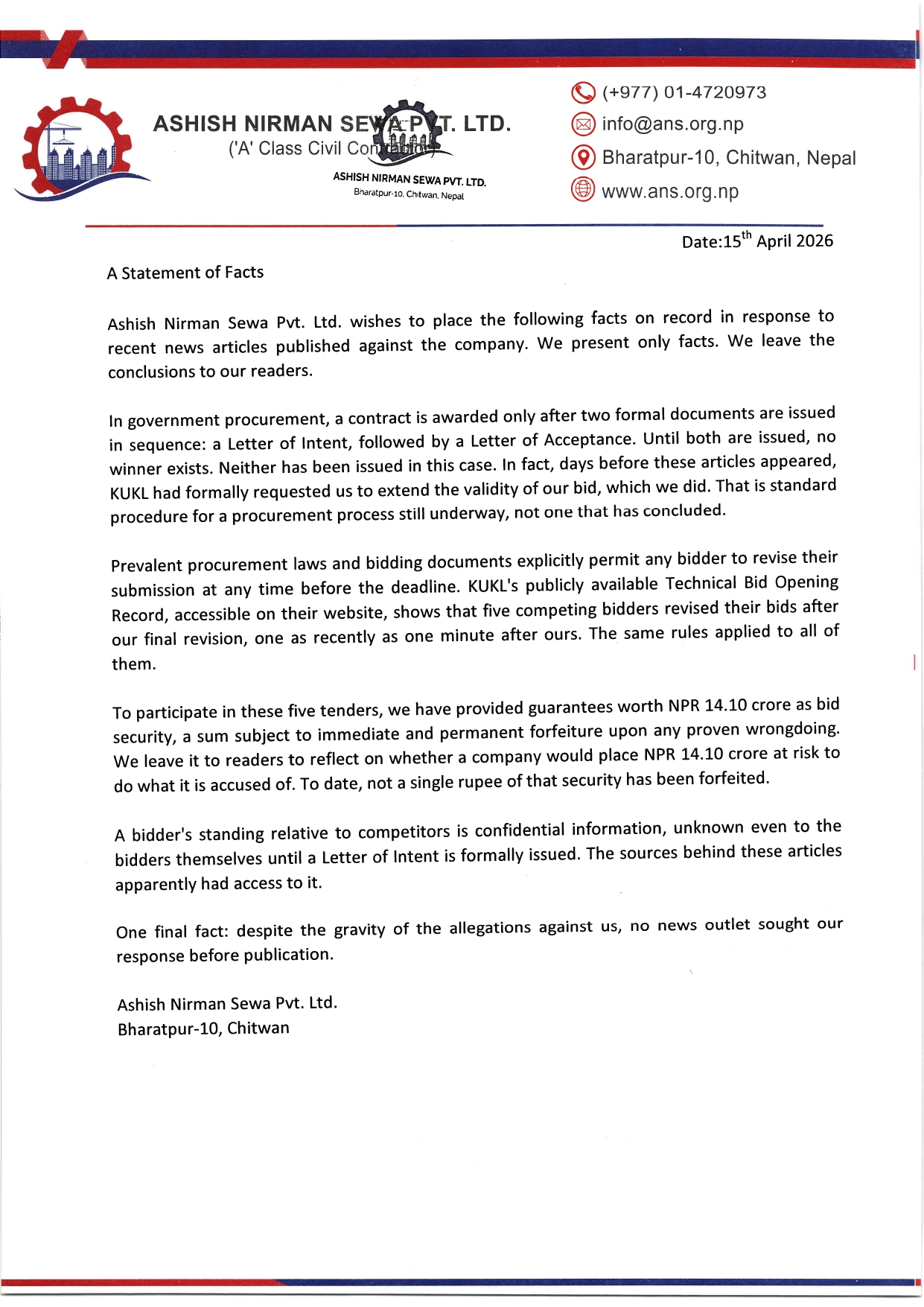 Ashish Nirman Sewa, leading, 'A' class construction company in Nepal.